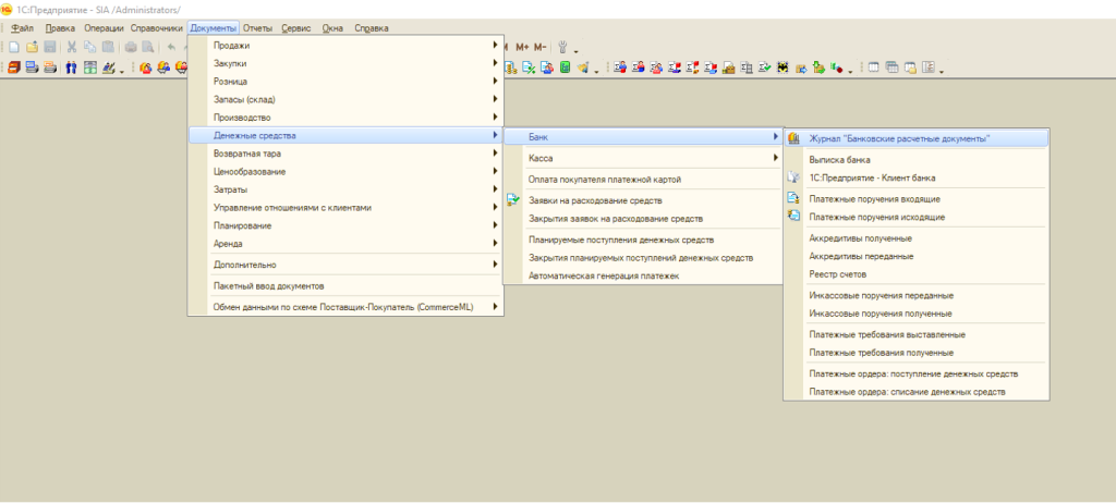 "Чтобы проверить, как были загружены платежи из файла загрузки Банка и проведены ли они, в программе 1С Управление торговлей 10 необходимо открыть Журнал «Банковские расчетные документы». Попасть в этот журнал можно, выбрав вкладку Документы --> Денежные средства --> Банк --> Журнал «Банковские расчетные документы»."