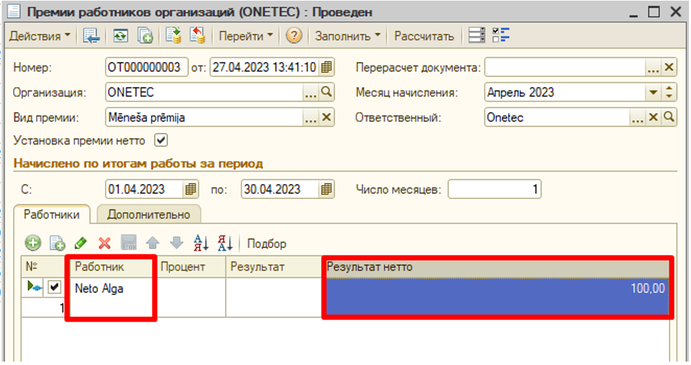 Для установки премии нетто необходимо в документе поставить галку Установка премии и заполнить табличную часть сотрудниками и заполнив колонку Результат нетто.