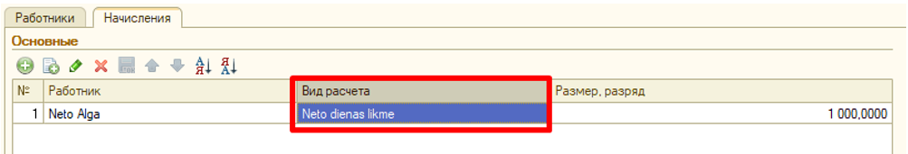 1. Для того, чтобы сотруднику применялся расчет нетто, необходимо при приеме на работу, либо в кадровом перемещении на закладке начисления выбрать Вид расчета на Neto dienas likme и указать необходимый размер нетто оклада.