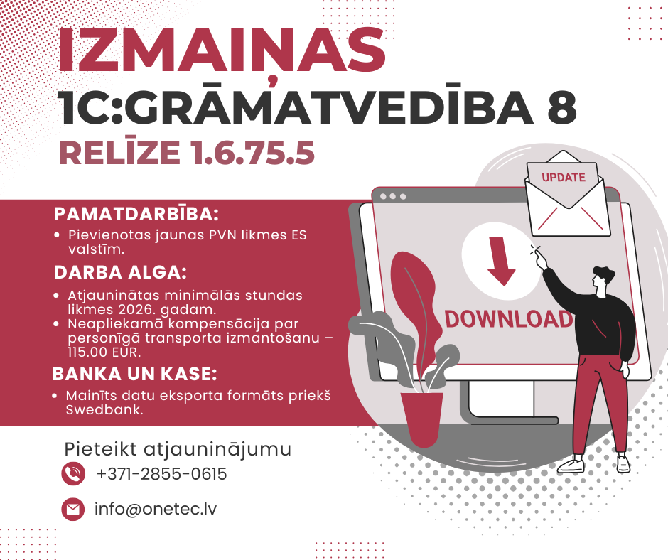 Jaunajā 1С:Grāmatvedība 8 versijā 1.6.75.5 ieviesti būtiski uzlabojumi, kas ietekmē uzņēmumu ikdienas grāmatvedības procesus Latvijā un Eiropas Savienībā.