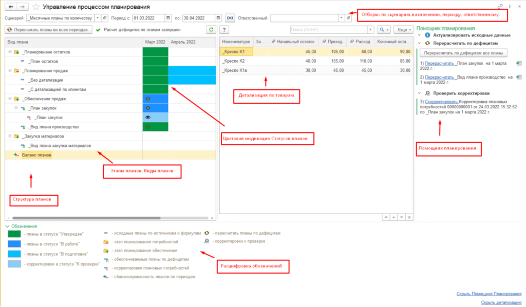 Это рабочее место в 1С:ERP, которое объединяет все этапы планирования в единую структуру. Вы можете видеть, как формируются остатки материалов, потребности в производстве, продажи, закупки и финансовые показатели, управляя ими в одном интерфейсе.